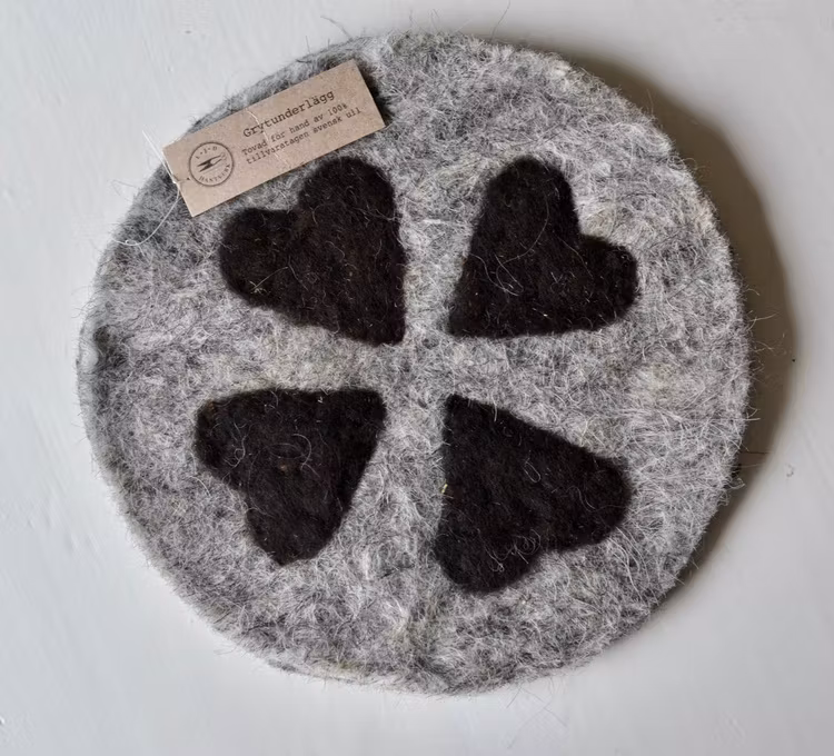 Grytunderlägg 175 kr Tovat grytunderlägg i 100% ull med motiv av hjärtan. Tack vare att ullen är isolerande, tål det varma föremål. Mått ca. 19 cm i diameter. Skötselråd: Produkten är slut i lager Dela Lagersaldo: Artikelnummer: 85 Information Tovat grytunderlägg i 100% ull med motiv av hjärtan. Tack vare att ullen är isolerande, tål det varma föremål. Mått ca. 19 cm i diameter. Skötselråd: Handtvätt vid behov.